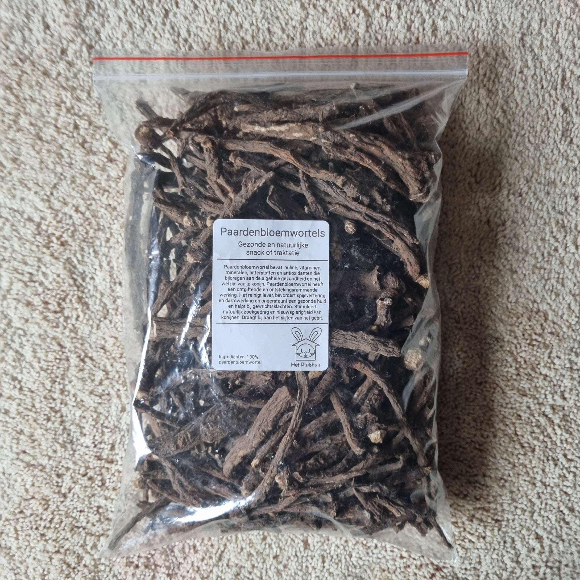 Paardenbloemwortel bevat veel inuline, bitterstoffen, vitaminen, mineralen en antioxidanten die bijdragen aan de algehele gezondheid en het welzijn van je konijn. Paardenbloemwortel heeft een ontgiftende en ontstekingsremmende werking. Het bevorderd de eetlust, ondersteund de spijsvertering, draagt bij aan een goede darmwerking, reinigt de lever, geeft een gezonde huid en helpt bij gewrichtsklachten.