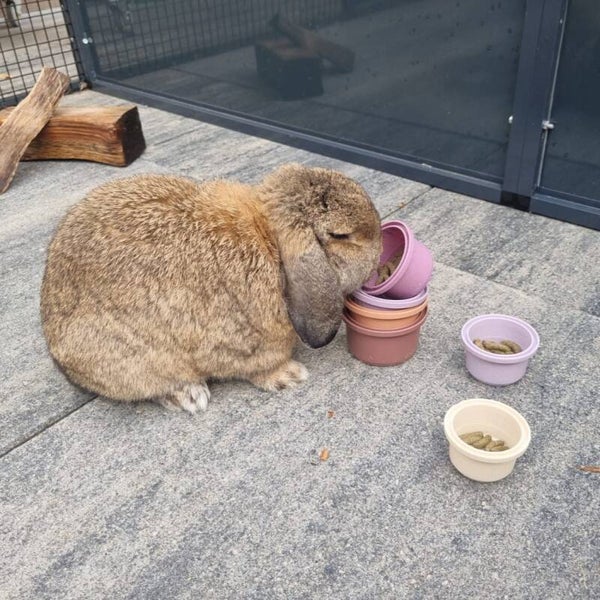 Het kan zijn dat je konijn niet direct snapt hoe het werkt. Blijf de eerste paar keren bij het konijn als je de stapelbekers aanbiedt. Doe in elk bekertje een paar brokjes / kruidjes / snackjes en zet deze (met de opening naar boven) allemaal uit elkaar op de grond Zo leert het konijn dat er iets lekkers in de bakjes zit. Vervolgens kan je het iets moeilijker maken door de bekers schuin op elkaar te zetten. Dan kunnen de konijnen het nog altijd makkelijk omduwen of van elkaar aftrekken met de tanden. De allermoeilijkste variant is alle bekers gestapeld neer te zetten of op zijn kop neer te zetten. Ze moeten dan met hun tanden de bekers van elkaar afhalen of omdraaien. Sommige konijnen zijn hier super snel mee en andere hebben meer tijd nodig om het te leren :-)